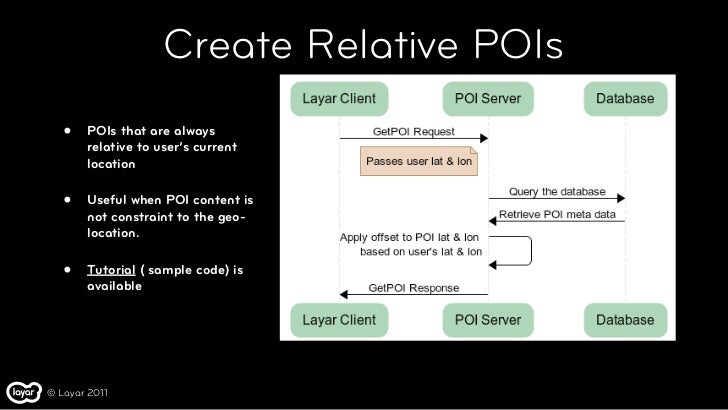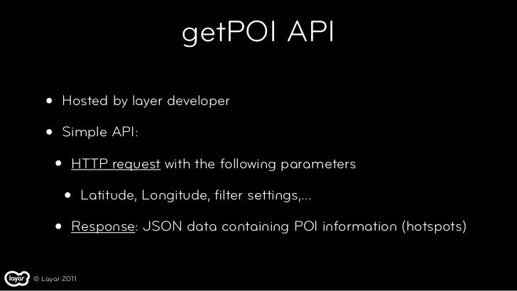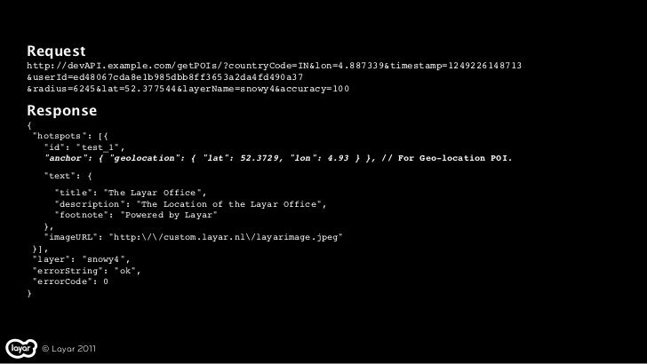 - 10. Requesthttp://devAPI.example.com/getPOIs/?countryCode=IN&lon=4.887339×tamp=1249226148713&userId=ed48067cda8e1b985dbb8ff3653a2da4fd490a37&radius=6245&lat=52.377544&layerName=snowy4&accuracy=100Response{ "hotspots": [{ "id": "test_1", "anchor": { "geolocation": { "lat": 52.3729, "lon": 4.93 } }, // For Geo-location POI. "text": { "title": "The Layar Office", "description": "The Location of the Layar Office", "footnote": "Powered by Layar" }, "imageURL": "http://custom.layar.nl/layarimage.jpeg" }], "layer": "snowy4", "errorString": "ok", "errorCode": 0} © Layar 2011