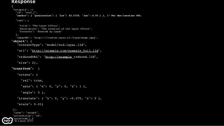- 13. Response{ "hotspots": [{ "id": "test_1", "anchor": { "geolocation": { "lat": 52.3729, "lon": 4.93 } }, // For Geo-location POI. "text": { "title": "The Layar Office", "description": "The Location of the Layar Office", "footnote": "Powered by Layar" }, "imageURL": "http://custom.layar.nl/layarimage.jpeg","object": { "contentType": "model/vnd.layar.l3d", "url": "http://example.com/example_full.l3d", "reducedURL": "http://example_reduced.l3d", "size": 2},"transform": { "rotate": { "rel": true, "axis": { "x": 0, "y": 0, "z": 1 }, "angle": 0 }, "translate": { "x": 0, "y": -0.075, "z": 0 }, "scale": 0.01} }], "layer": "snowy4", "errorString": "ok", "errorCode": 0} © Layar 2011