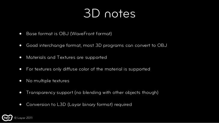 - 14. 3D notes • Base format is OBJ (WaveFront format) • Good interchange format, most 3D programs can convert to OBJ • Materials and Textures are supported • For textures only diffuse color of the material is supported • No multiple textures • Transparency support (no blending with other objects though) • Conversion to L3D (Layar binary format) required© Layar 2011