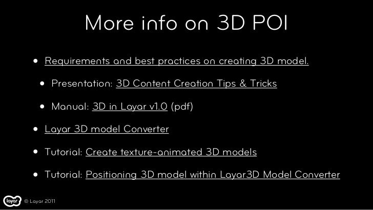 - 15. More info on 3D POI • Requirements and best practices on creating 3D model. • Presentation: 3D Content Creation Tips & Tricks • Manual: 3D in Layar v1.0 (pdf) • Layar 3D model Converter • Tutorial: Create texture-animated 3D models • Tutorial: Positioning 3D model within Layar3D Model Converter© Layar 2011