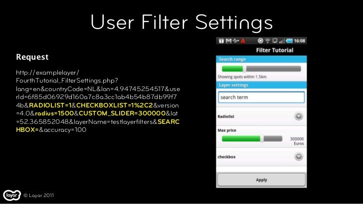 - 16. User Filter SettingsRequesthttp://examplelayer/FourthTutorial_FilterSettings.php?lang=en&countryCode=NL&lon=4.94745254517&userId=6f85d06929d160a7c8a3cc1ab4b54b87db99f74b&RADIOLIST=1&CHECKBOXLIST=1%2C2&version=4.0&radius=1500&CUSTOM_SLIDER=300000&lat=52.365852048&layerName=testlayerfilters&SEARCHBOX=&accuracy=100 © Layar 2011