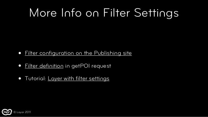 - 17. More Info on Filter Settings • Filter configuration on the Publishing site • Filter definition in getPOI request • Tutorial: Layer with filter settings© Layar 2011