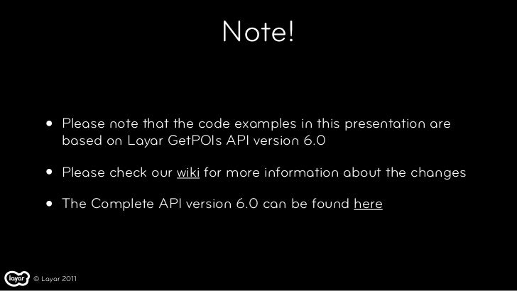 - 2. Note! • Please note that the code examples in this presentation are based on Layar GetPOIs API version 6.0 • Please check our wiki for more information about the changes • The Complete API version 6.0 can be found here© Layar 2011