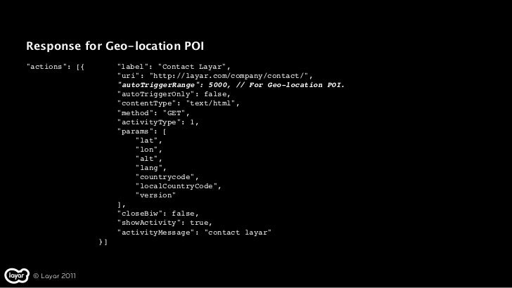 - 20. Response for Geo-location POI"actions": [{" " "label": "Contact Layar", "uri": "http://layar.com/company/contact/", "autoTriggerRange": 5000, // For Geo-location POI. "autoTriggerOnly": false, "contentType": "text/html", "method": "GET", "activityType": 1, "params": [ "lat", "lon", "alt", "lang", "countrycode", "localCountryCode", "version" ], "closeBiw": false, "showActivity": true, "activityMessage": "contact layar" }] © Layar 2011