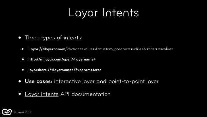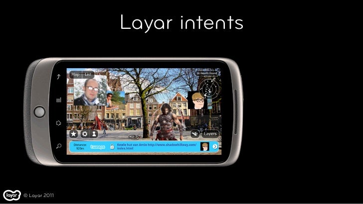 - 25. Layar Intents • Three types of intents: • Layar://<layername>/?action=<value>&<custom_param>=<value>&<filter>=<value> • http://m.layar.com/open/<layername> • layarshare://<layername>/?<parameters> • Use cases: interactive layer and point-to-point layer • Layar intents API documentation© Layar 2011