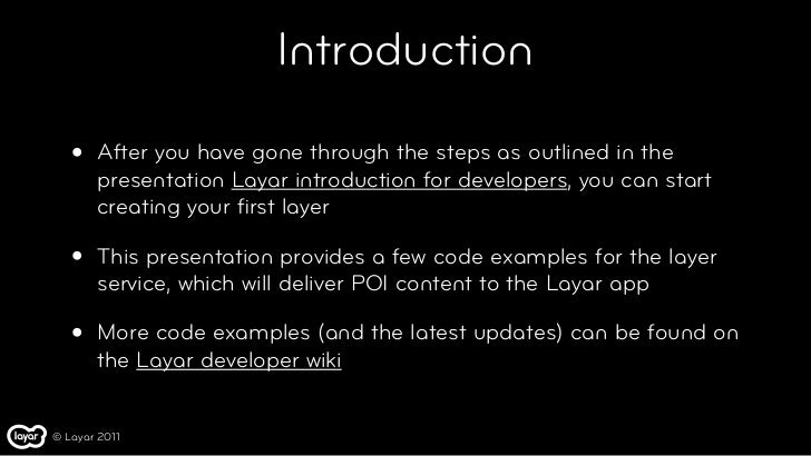- 3. Introduction • After you have gone through the steps as outlined in the presentation Layar introduction for developers, you can start creating your first layer • This presentation provides a few code examples for the layer service, which will deliver POI content to the Layar app • More code examples (and the latest updates) can be found on the Layar developer wiki© Layar 2011