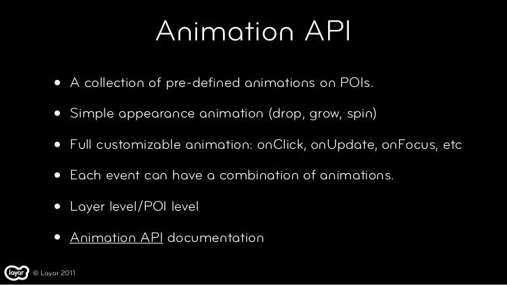 - 30. Animation API • A collection of pre-defined animations on POIs. • Simple appearance animation (drop, grow, spin) • Full customizable animation: onClick, onUpdate, onFocus, etc • Each event can have a combination of animations. • Layer level/POI level • Animation API documentation© Layar 2011