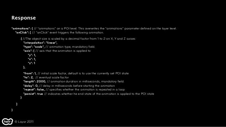 - 31. Response"animations": { // "animations" on a POI level. This overwrites the "animations" parameter defined on the layer level. "onClick": [ // "onClick" event triggers the following animation. .{ //The object size is scaled by a decimal factor from 1 to 2 on X, Y and Z axises "interpolation": "linear", "type": "scale", // animation type, mandatory field. "axis": { // axis that the animation is applied to "y": 1, "x": 1, "z": 1 }, "from": 1, // initial scale factor, default is to use the currently set POI state "to": 2, // eventual scale factor "length": 2000, // animation duration in milliseconds, mandatory field. "delay": 0, // delay in milliseconds before starting the animation "repeat": false, // specifies whether the animation is repeated in a loop "persist": true // indicates whether he end state of the animation is applied to the POI state } ]} © Layar 2011