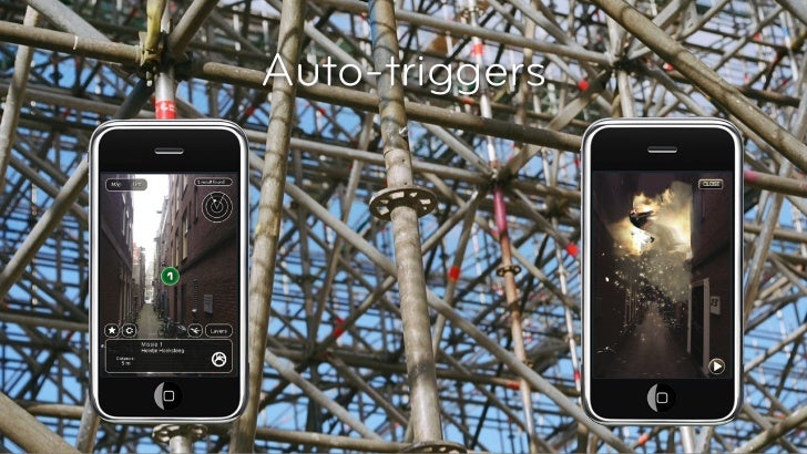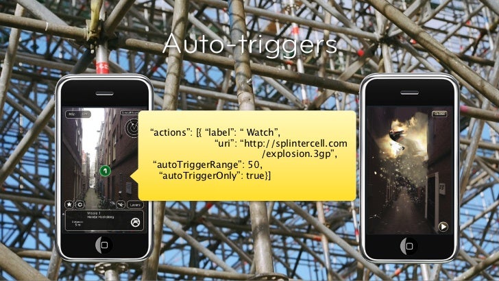 - 35. Auto-triggers “actions”: [{ “label”: “ Watch”, “uri”: “http://splintercell.com /explosion.3gp”, “autoTriggerRange”: 50, “autoTriggerOnly”: true}]© Layar 2011