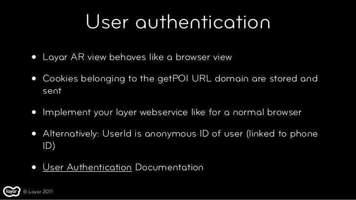 - 37. User authentication • Layar AR view behaves like a browser view • Cookies belonging to the getPOI URL domain are stored and sent • Implement your layer webservice like for a normal browser • Alternatively: UserId is anonymous ID of user (linked to phone ID) • User Authentication Documentation© Layar 2011