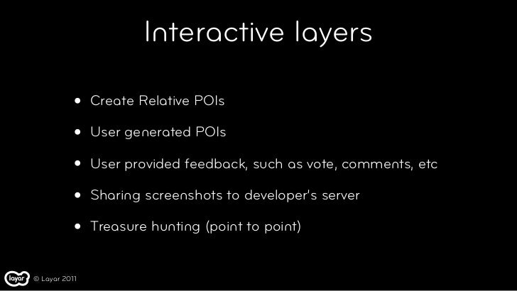 - 38. Interactive layers • Create Relative POIs • User generated POIs • User provided feedback, such as vote, comments, etc • Sharing screenshots to developer’s server • Treasure hunting (point to point)© Layar 2011