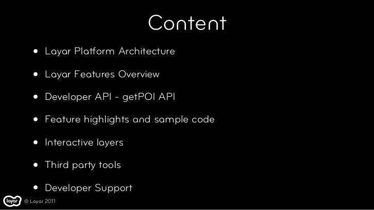 - 4. Content • Layar Platform Architecture • Layar Features Overview • Developer API - getPOI API • Feature highlights and sample code • Interactive layers • Third party tools • Developer Support© Layar 2011