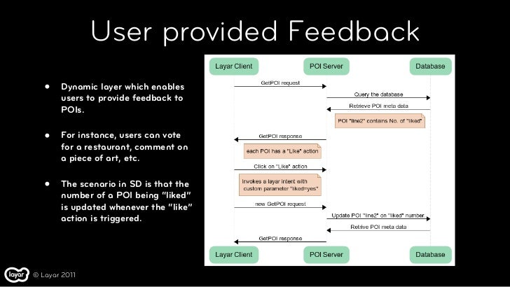- 40. User Generated POIs • Dynamic layer where users can create a POI in it. • Normally POI’s location is relevant to user’s location. • More info on Layar intent and actions • The Sequence Diagram explains how to insert a POI by filling in a web form within the layer.© Layar 2011