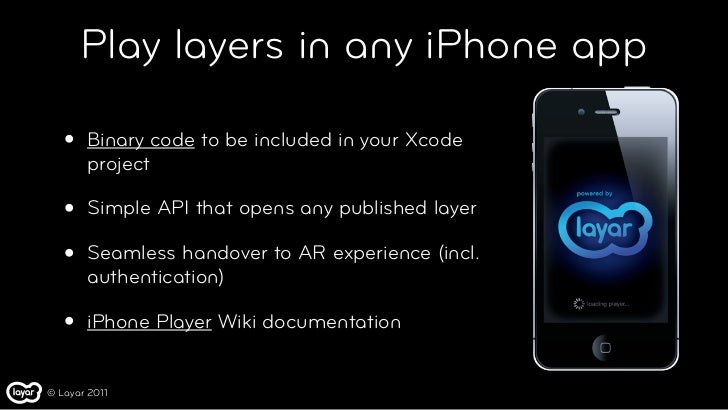 - 44. Play layers in any iPhone app • Binary code to be included in your Xcode project • Simple API that opens any published layer • Seamless handover to AR experience (incl. authentication) • iPhone Player Wiki documentation© Layar 2011