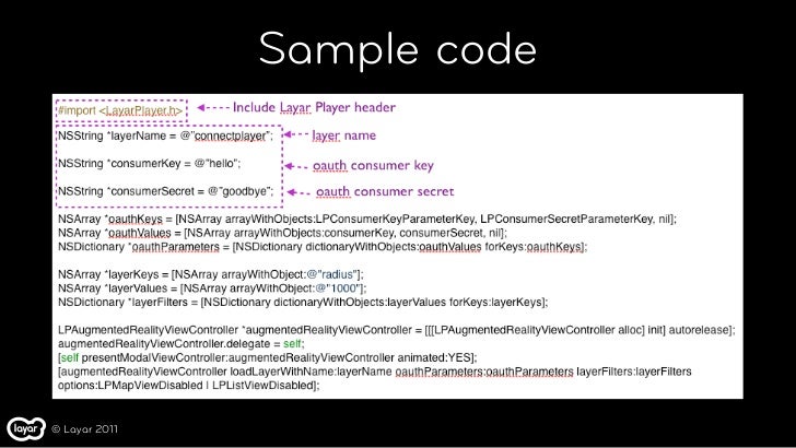 - 1. Layar code examplesfor developersCreating augmented reality experiences for the world’s leading platformAugust 2011