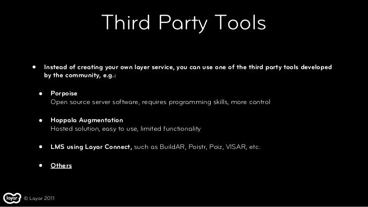 - 46. Third Party Tools • Instead of creating your own layer service, you can use one of the third party tools developed by the community, e.g.: • Porpoise Open source server software, requires programming skills, more control • Hoppala Augmentation Hosted solution, easy to use, limited functionality • LMS using Layar Connect, such as BuildAR, Poistr, Poiz, VISAR, etc. • Others© Layar 2011