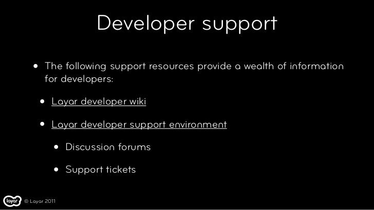 - 47. Developer support • The following support resources provide a wealth of information for developers: • Layar developer wiki • Layar developer support environment • Discussion forums • Support tickets© Layar 2011