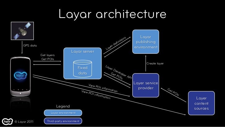 - 5. Layar architecture ns Layar n itio publishing fi de GPS data y er environment La Layar server Get layers Get POIs Create layer La Fixed yer De v data Ge elop tP e OIs r AP I View Layer service POI in forma tion provider Ge View tP POI i OI nform s ation Layer content Legend sources Layar environment© Layar 2011 Third-party environment