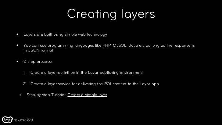 - 7. Creating layers • Layers are built using simple web technology • You can use programming languages like PHP, MySQL, Java etc as long as the response is in JSON format • 2 step process: 1. Create a layer definition in the Layar publishing environment 2. Create a layer service for delivering the POI content to the Layar app • Step by step Tutorial: Create a simple layer© Layar 2011